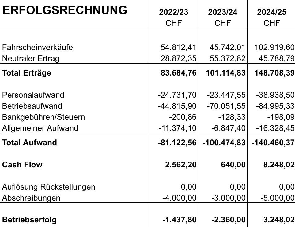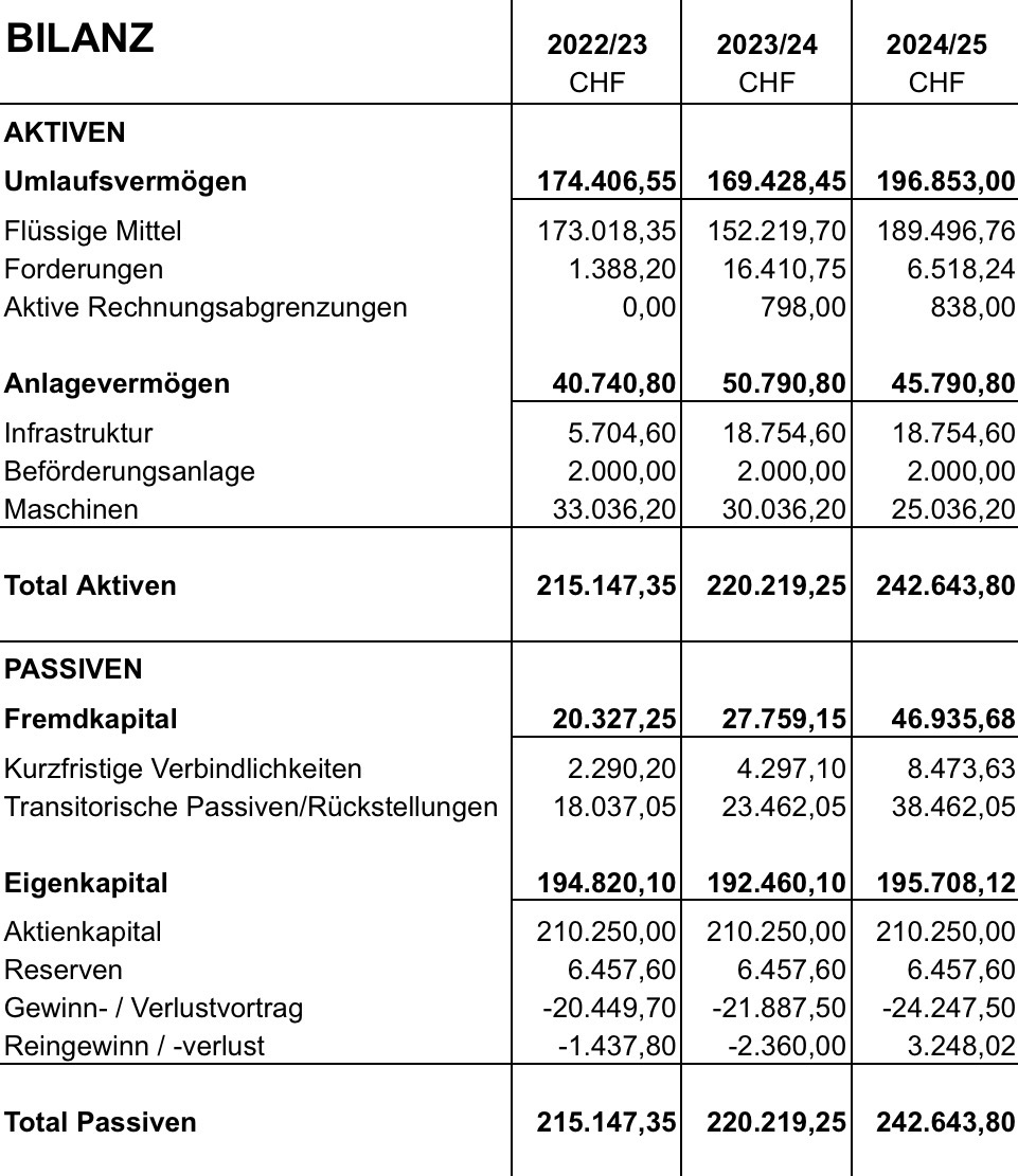 Unser Dank gilt aber auch Ihnen, liebe Aktionärinnen und Aktionäre, für Ihre Treue und Ihre Unterstützung. Sie ermöglichen es uns, auch in herausfordernden Zeiten den Betrieb aufrechtzuerhalten, mutige Entscheidungen zu treffen und SchneeSelital als sympathisches, authentisches Wintersportziel in der Region und darüber hinaus weiter aufrecht zu erhalten. Dieses Jahr können wir sogar ein positives Ergebnis in der Höhe von CHF 3‘248.02 ausweisen. Das ist kein riesiger Betrag. Aus unserer Sicht ist es aber in der aktuellen Zeit ein wertvolles Zeichen dafür, dass wir weiterhin auf dem richtigen Weg sind.